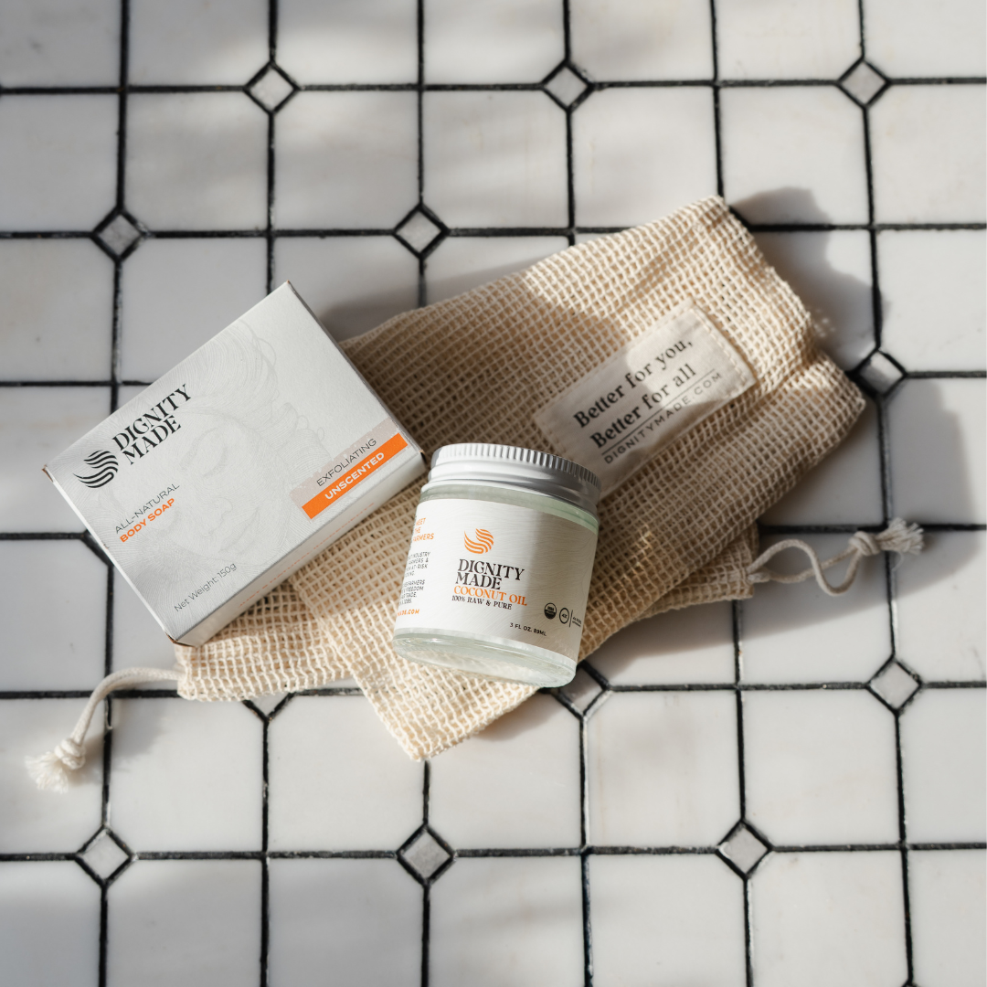 The Exfoliate and Glow Starter Set turns an everyday shower into a simple self care ritual. Use the exfoliating soap bar to gently cleanse and polish skin, then use Raw Coconut Oil after your shower to hydrate and moisturize.