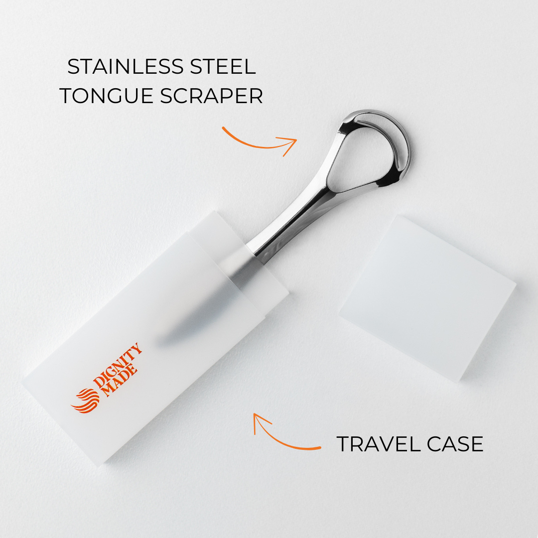 Upgrade your oral care routine with this stainless steel tongue scraper and travel case. Designed for easy one-handed use, the tongue scraper removes odor-causing bacteria and promotes fresher breath in seconds. Comes with a sleek travel case so you can keep your scraper clean and protected wherever you go!